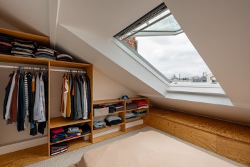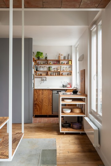 Vue sur la Halle Pajol et la Sacré Cœur et rangements sur mesure en contreplaqué de pin maritime, réalisés par Atelier Auseral.