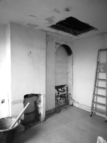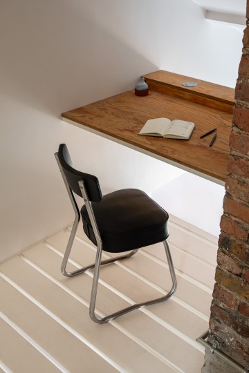 Suppression des conduits de cheminées inutilisés qui séparaient les 2 pièces existantes et suspension d’un escalier minimal. Remplissage entre poutres de reprise de la partie conservée des cheminées avec des briques foraines en réemploi.