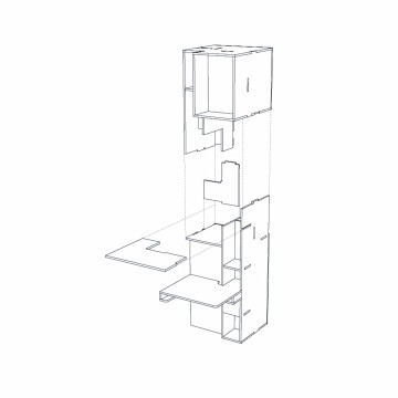 Construction haute à la double personnalité, glissée derrière le trumeau restant d’un mur de refend. Système complexe d’emboitements simples de panneaux de contreplaqué de peuplier. Deux queues d’aronde. Entièrement démontable.