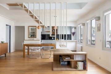Après avoir réalisé les premiers travaux d’aménagement de leur appartement après leur achat en 2016, nous voilà de nouveau sur le même projet suite à l’achat de 2 chambres de bonnes au-dessus de leur appartement actuel. Un nouvel aménagement qui offre de nouveau de magnifiques espaces tout en lumière et jeux de combles. Cerise sur le gâteau : un escalier central suspendu sur mesure tout en légèreté !