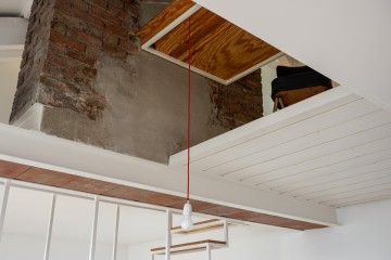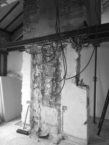 Suppression des conduits de cheminées inutilisés qui séparaient les 2 pièces existantes et suspension d’un escalier minimal. Remplissage entre poutres de reprise de la partie conservée des cheminées avec des briques foraines en réemploi.