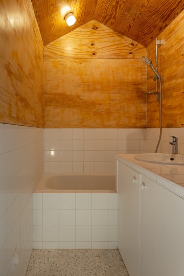 Panneaux bois, carrelage de sol et appareils sanitaires glanés en réemploi.