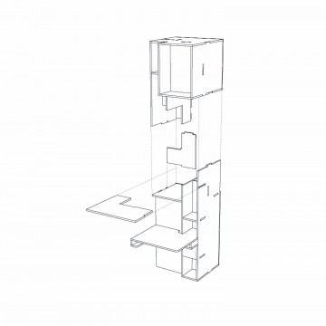 Construction haute à la double personnalité, glissée derrière le trumeau restant d’un mur de refend. Système complexe d’emboitements simples de panneaux de contreplaqué de peuplier. Deux queues d’aronde. Entièrement démontable.